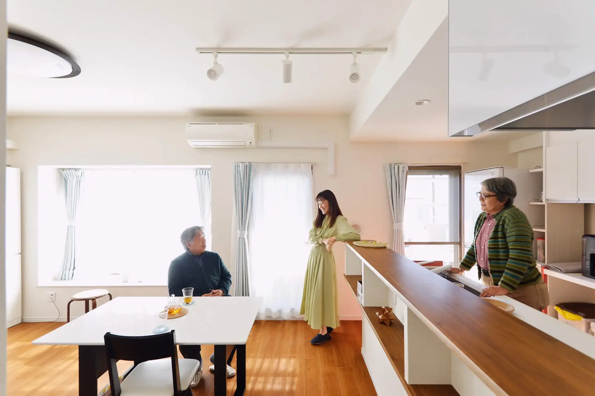 リノベーションでは、広々としたリビングやフレキシブルな間仕切りを提案し、家族が集まりやすい空間を作ります。